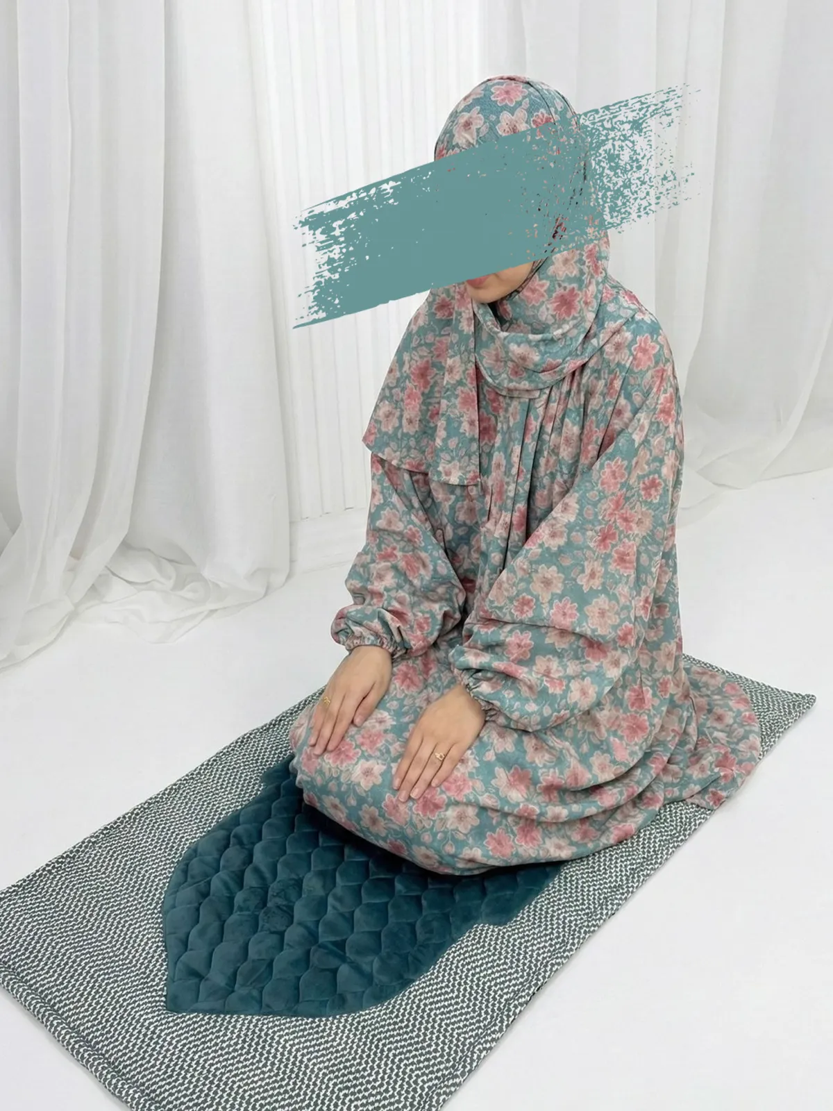 Comfortable prayer outfit with a loose fit, soft floral pattern, and attached headscarf
